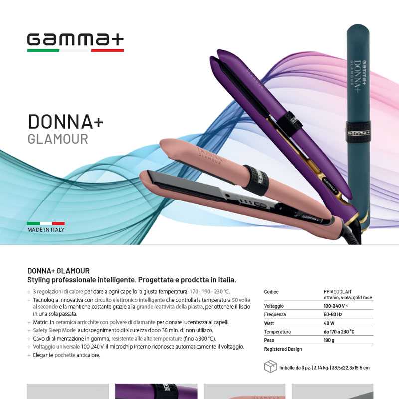 Per chi non si accontenta della qualità, ma prentende anche stile, la piastra Donna+ diventa Glamour, nella versione Gold Rose, Ottanio e Viola, ancora più esclusiva e unica.